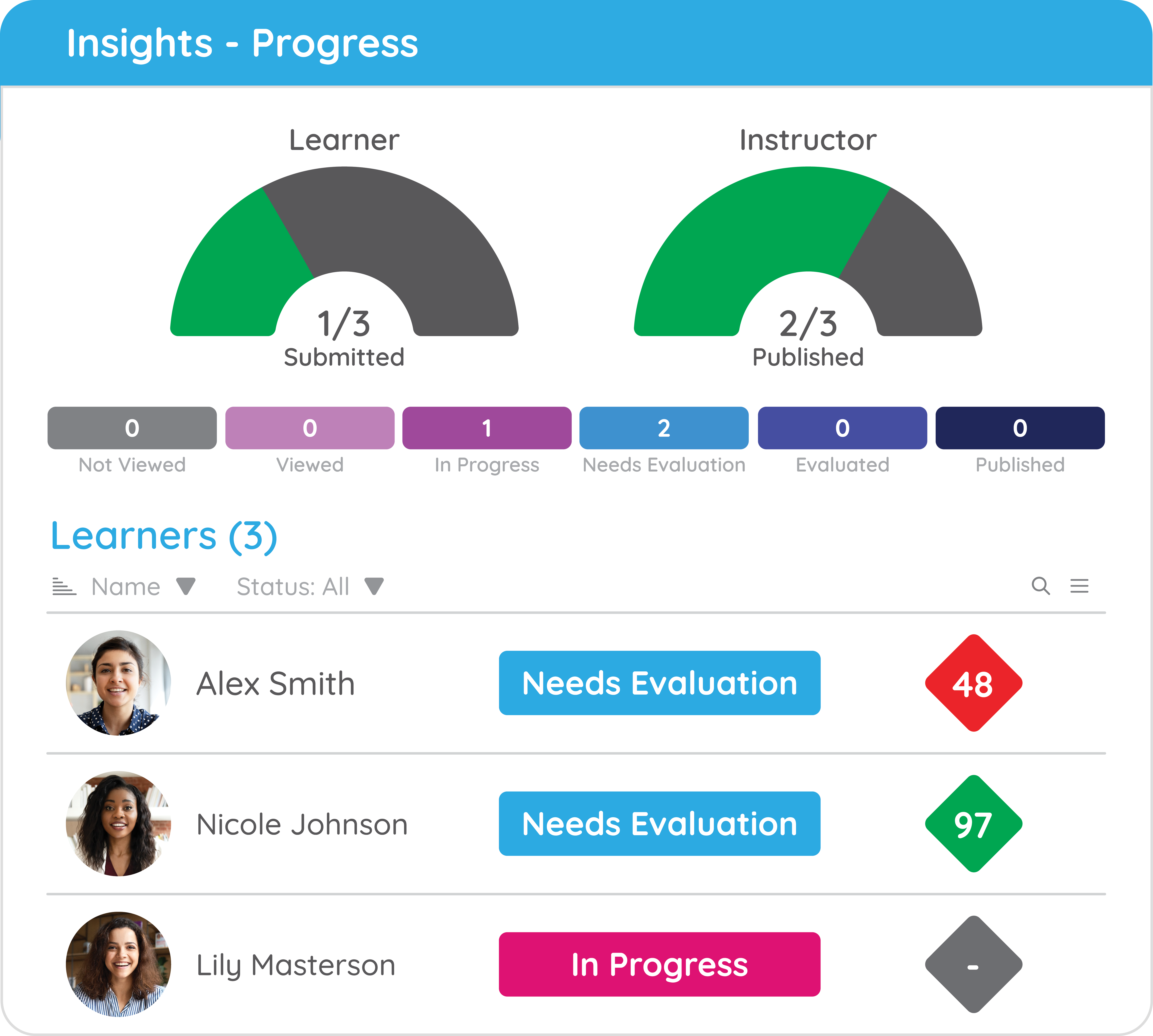 Video assignments combined with our AI feedback options drive skill development for learners through a combination of practice, demonstration, and feedback.