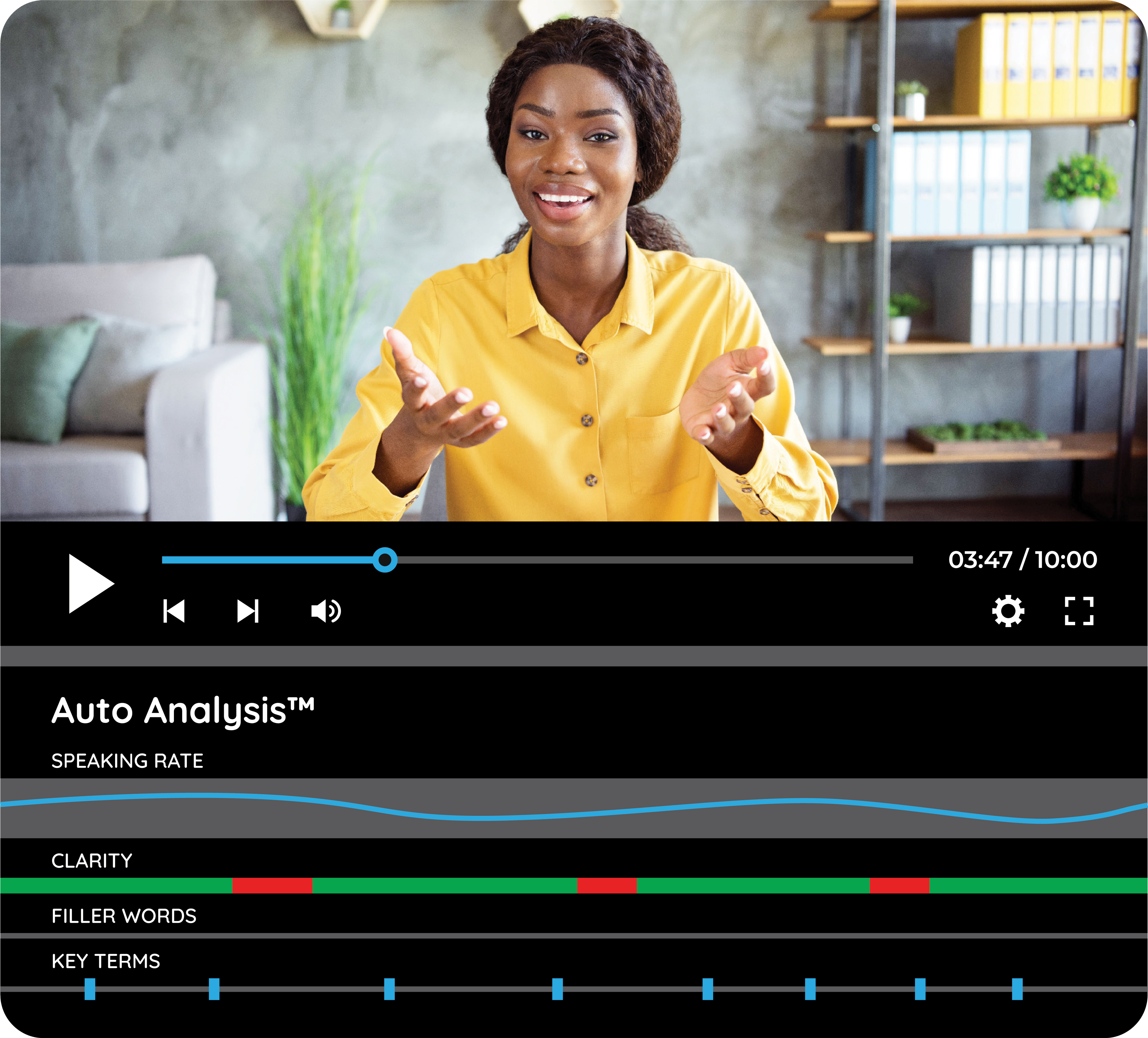 Supplementing the AI, managers and peers can add their own personalized feedback by making time-stamped text and video comments on the delivery submitted.